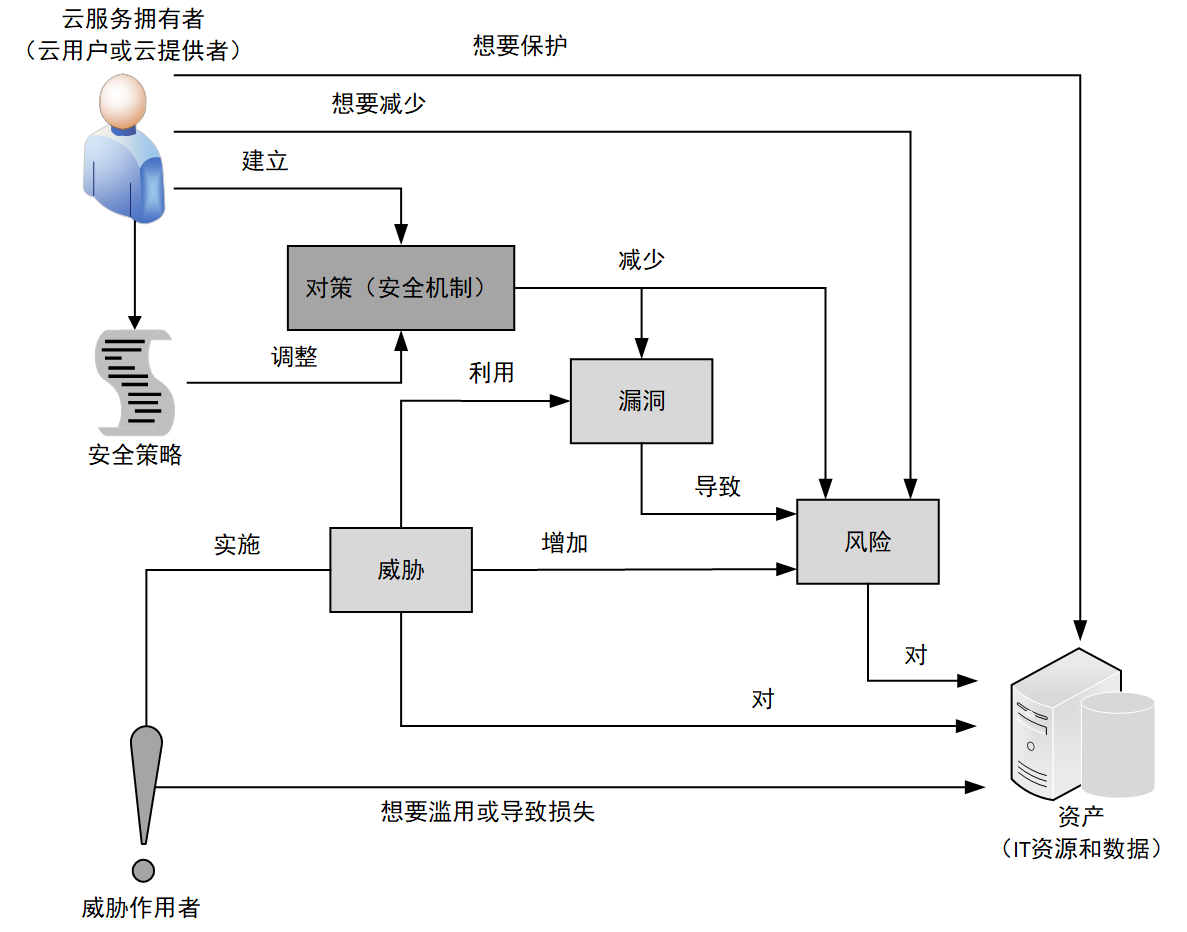 威胁作用者是引发威胁的实体,因为它能够实施攻击。云安全威胁可能来自内部或外部,可能来自于人也可能来自于软件程序。相对于漏洞、威胁和风险以及安全策略机制建立起来的保护措施而言,威胁作用者所承担的角色如下图所示: